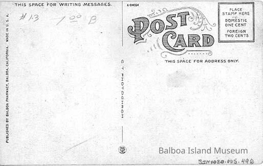 Unused. Published by Balboa Pharmacy in Balboa and made in the USA. Printed by Curteich-Chicago (C. T. Photochrom) in Chicago. Postcard number A-84024. Stamp box reads "Place Stamp Here Domestic One Cent Foreign Two Cents" inside a triple solid frame.Subject