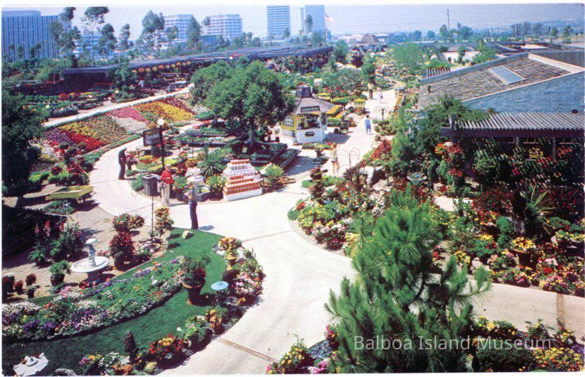 A color photograph taken from an elevated position of Roger's Garden grounds near the main showroom area. Several winding paths are visible with the main building to the right and a small kiosk in the middle. One of the other buildings is on the left and elevated. The gardens themselves are beautiful with a line of interlocking flower beds in differing colors along the hill side.