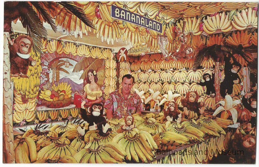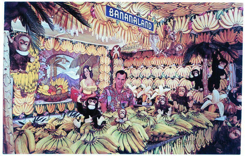 A color postcard taken from Don Phillips 'Bananaland", coverd in bananas and monkeys. The back wall is painted with a tropical scene. All of the walls and ceiling are painted with bananas. Stuffed monkeys are scattered throughout, including hanging from a fake palm trees. Don Phillips is sitting behind the counter. The back reads: