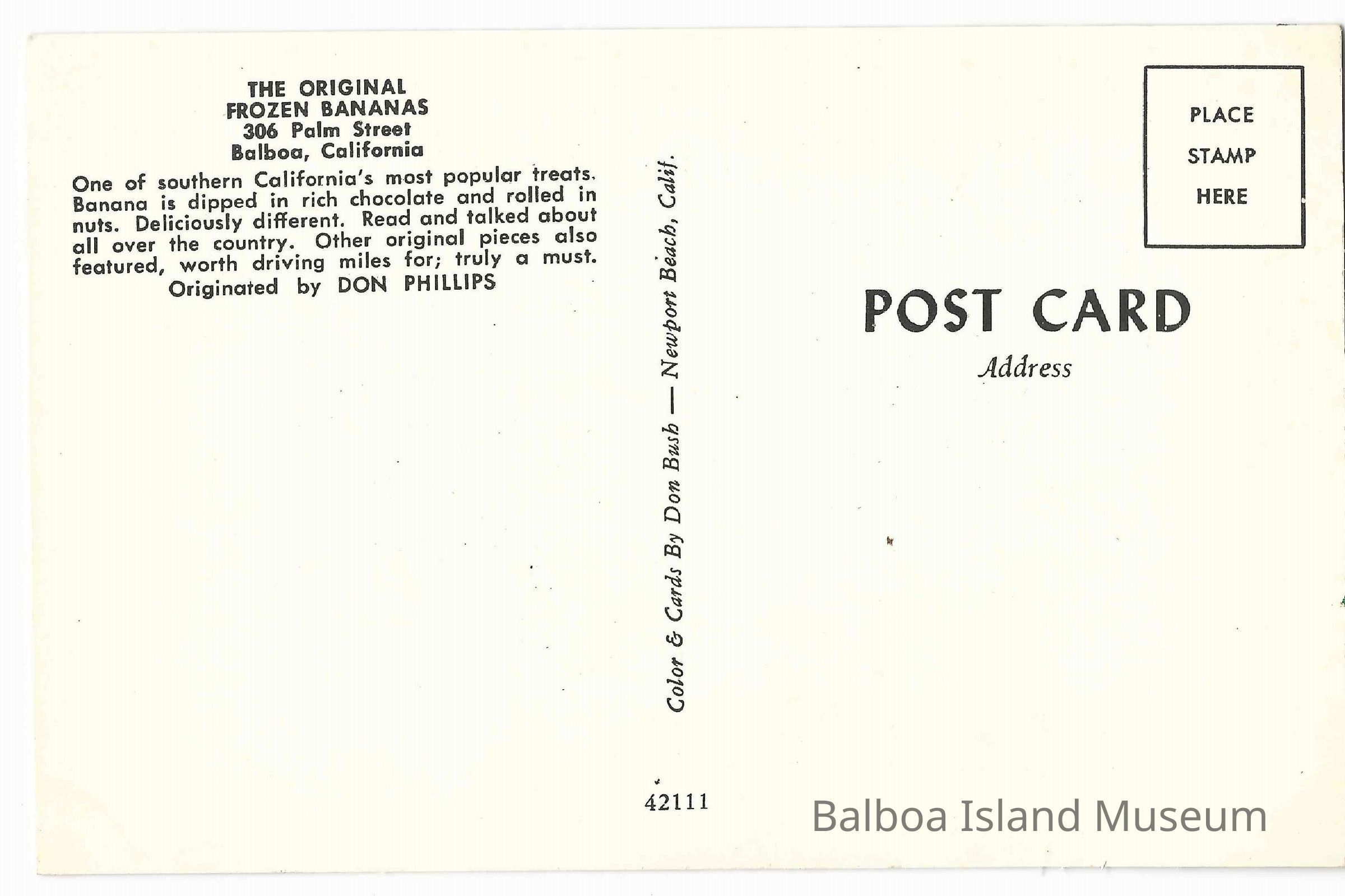 One of Sourthern California's most popular treets. Banana is dipped in rich chocolate and rolled in nuts. Deliciously different. Read and talked about all over the country. Other original pieces also featured, worht driving miles for; truly a must. Originated by Don Phillips.