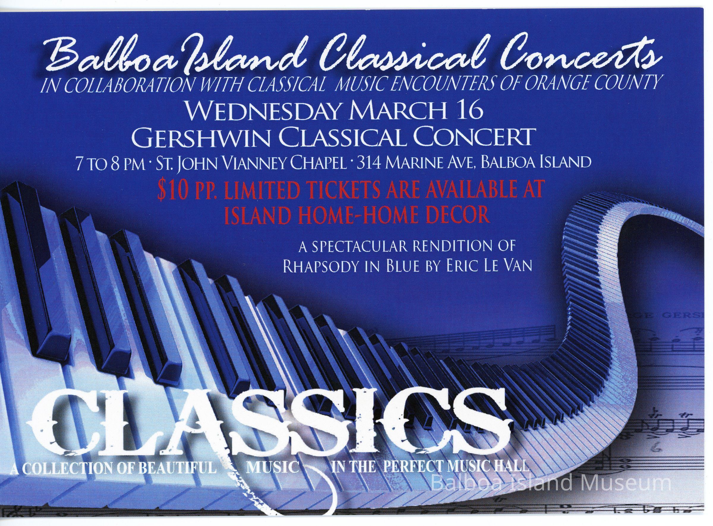 A small blue postcard flier with a digital image of a curving piano keyboard overlaying sheet music printed beneath the information regarding the time and place of the classical concert as well as the musician playing. Part of the Classical Concerts series held at St. John Vianney Chapel.Lexicon
