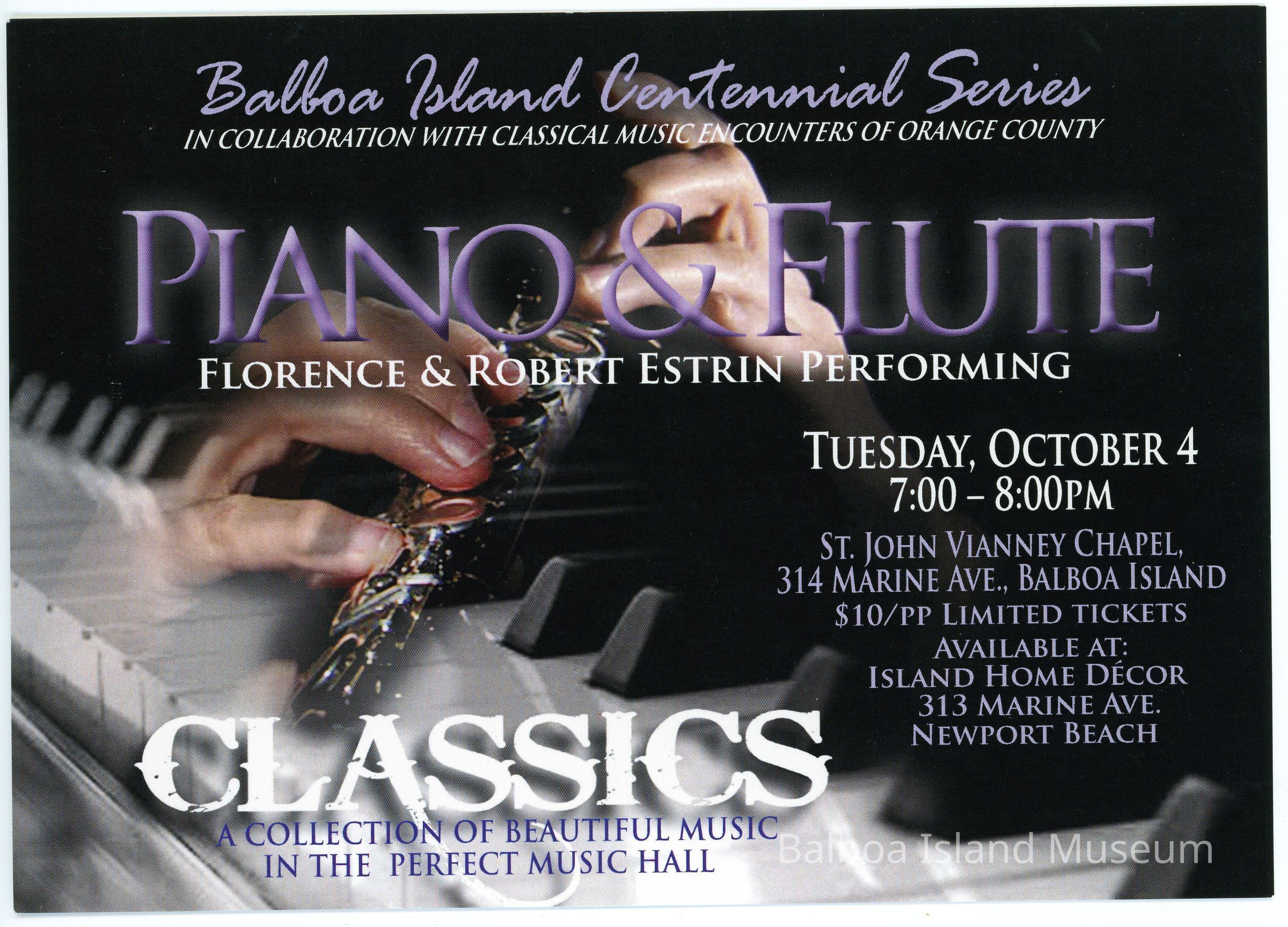 a postcard flier for the Balboa Island Centennial series held at the St. John Vianney Chapel. The series featured classical music performed by various artists. The flier features a photograph of a piano with a flute being played overlaid across the top. The artists were Florence and Robert Estrin and it was a Piano and flute concert. Held on Tuesday, October 4, 2016.Lexicon