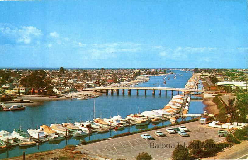 A color photograph postcard taken from above the yacht basin to the left of the Balboa Island Bridge. It looks towards Balboa Island and a bit of little island. The yacht basin parking lot is visible with seven cars in it.