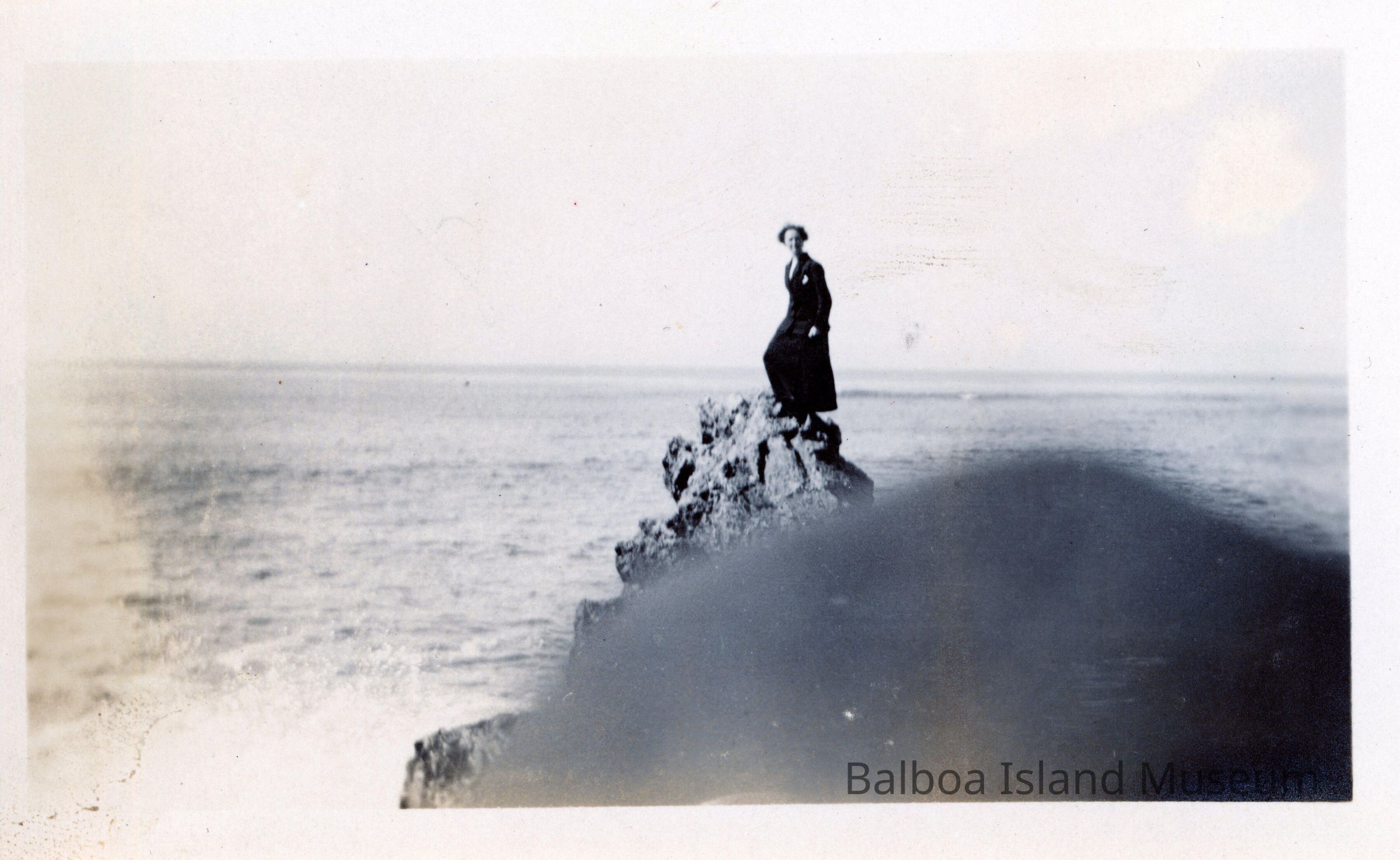 A photograph of a woman standing on one of the taller rocks at Corona del Mar state beach. The photographer accidentally caught either a finger or some piece of their clothing on the bottom edge of the photograph. The woman has climbed to the top of the rock and is standing there in a long dress.