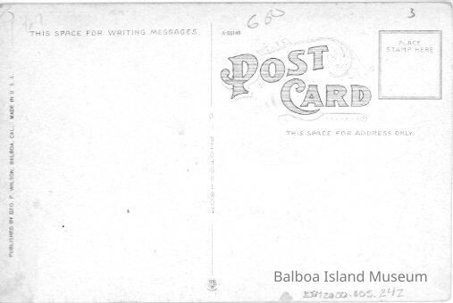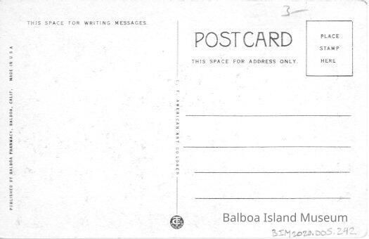 Both unused. The postcard without a border was published by George P. Wilson in Balboa, California. The postcard with a border was published by Balboa Pharmacy. Both were made in the USA by Curteich-Chicago. Printer number A-55148/ 55148.Subject