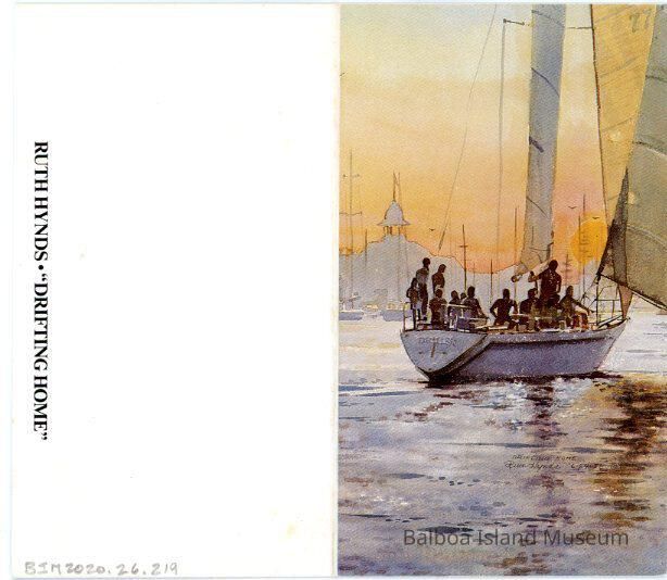 A small notecard of a group of sailors on a boat in Newport Harbor. The Balboa Pavilion is an outline behind them. There are about 11 people on the boat. The original piece is titled "Drifting Home" by Ruth Hynds and was painted in the 1980s.Collection