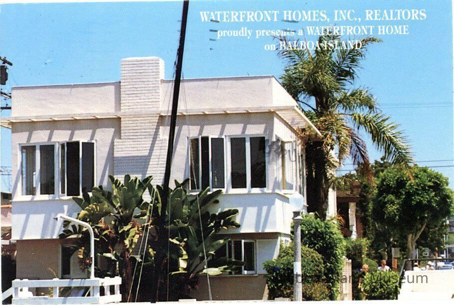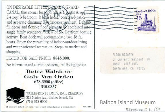 A color advertising postcard for 200 Grand Canal. The writing across the top on the front reads "Waterfront Homes, Inc., Realtors Proudly Presents a Waterfront Home on Balboa Island." It's listed by Bette Walsh and Goly Van Orden, whose information is on the back of the postcard. It was sent to Flora Bozarth in Santa Ana on October 17, 1989. Printed in 1989 according to the date at the bottom of the card.Subject