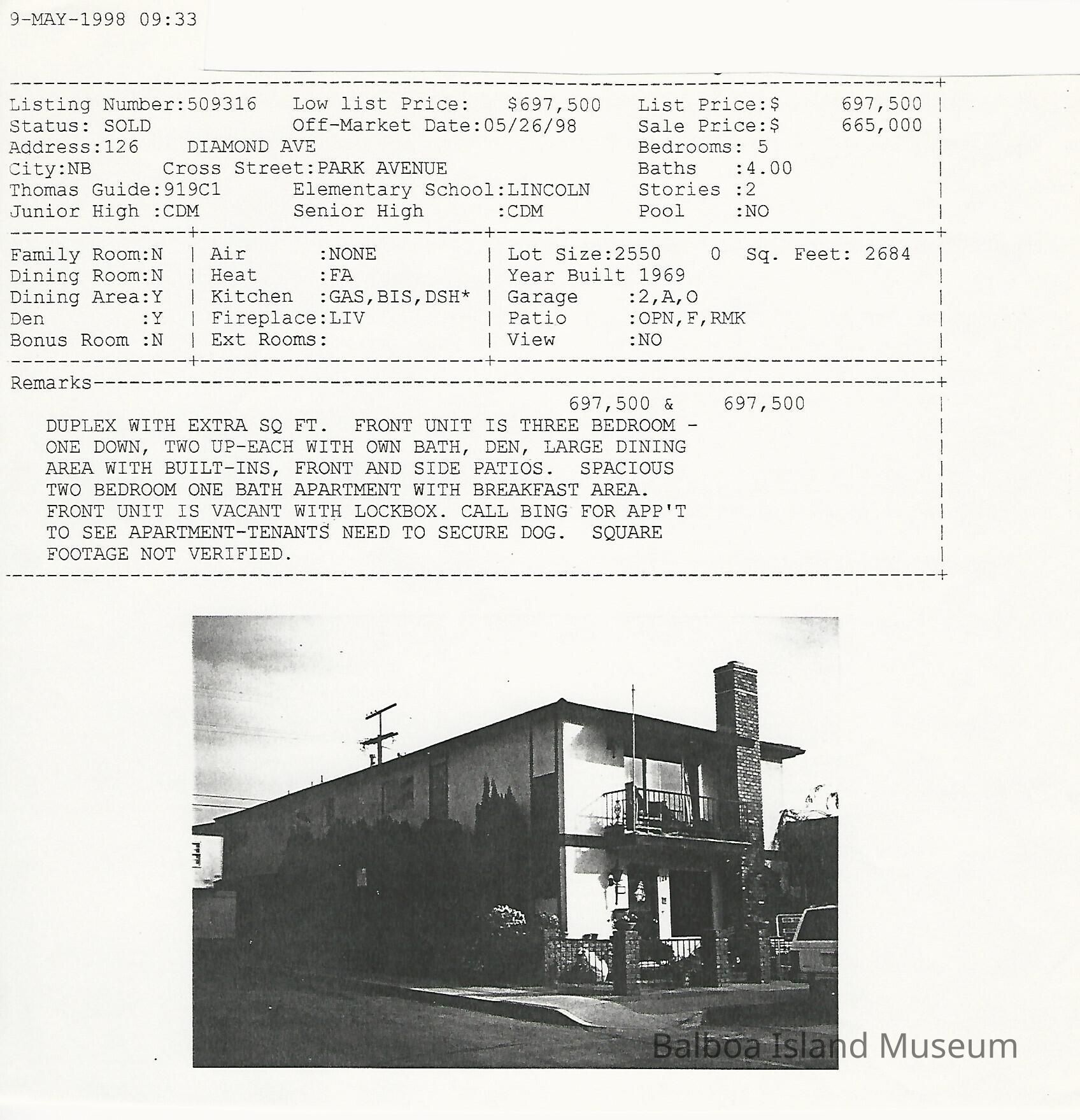 A black and white information sheet printed on May 9th, 1998 on 126 Diamond Avenue. It contains technical information on the property, year built (1969), and other information. It was a duplex at the time. Listed at $697,500.Date(s) of Creation