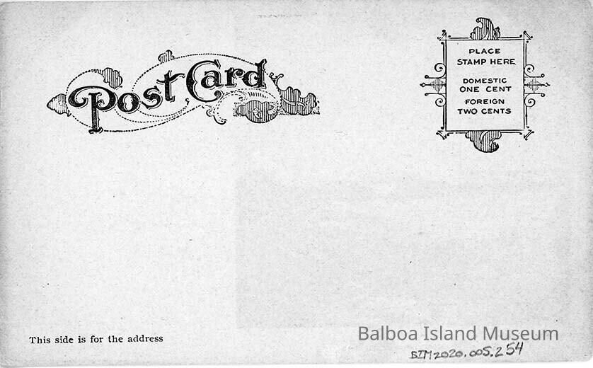 Undivided back. Unused. Printed by Wood's Post Cards in Los Angeles. Postcard or photograph 116. Stamp box has a elaborate frame with leaves and small spikes with the words "Place Stamp Here Domestic One Cent Foreign Two Cents" inside. Back is for the address only.Subject
