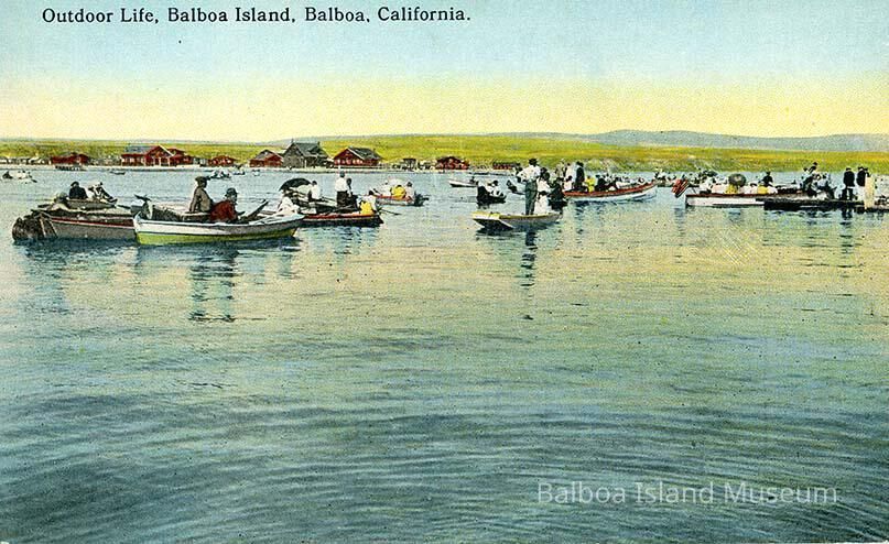 A colorized photograph postcard of boats on the harbor around the 1920s when small boats were still the only really navigable craft in the harbor. Balboa Island can be seen in the background. Taken from the left of the East Newport dock (see BIM2020.005.500 for comparison).