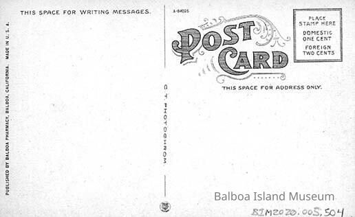 Unused. Published by Balboa Pharmacy in Balboa and made in the USA. Printed by Curteich-Chicago (C. T. Photochrom) in Chicago. Postcard printer number A-84025. Stamp box reads "Place Stamp here; Domestic one cent; Foreign two cent" inside a three frame border.Subject