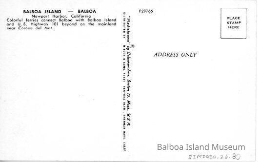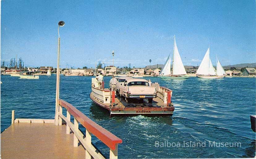 A photograph postcard of the Balboa Island Ferry pulling away from the dock on the Peninsula side.