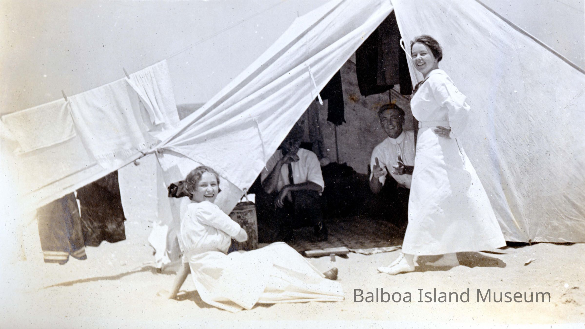 A photograph of two women standing outside their tent on Balboa Island while two men kneel inside. There are swimsuits and sheets or blankets hanging on one of the tent's lines to the left. Taken around July 4, 1911. Adhered to black album page 2.
