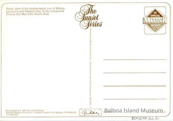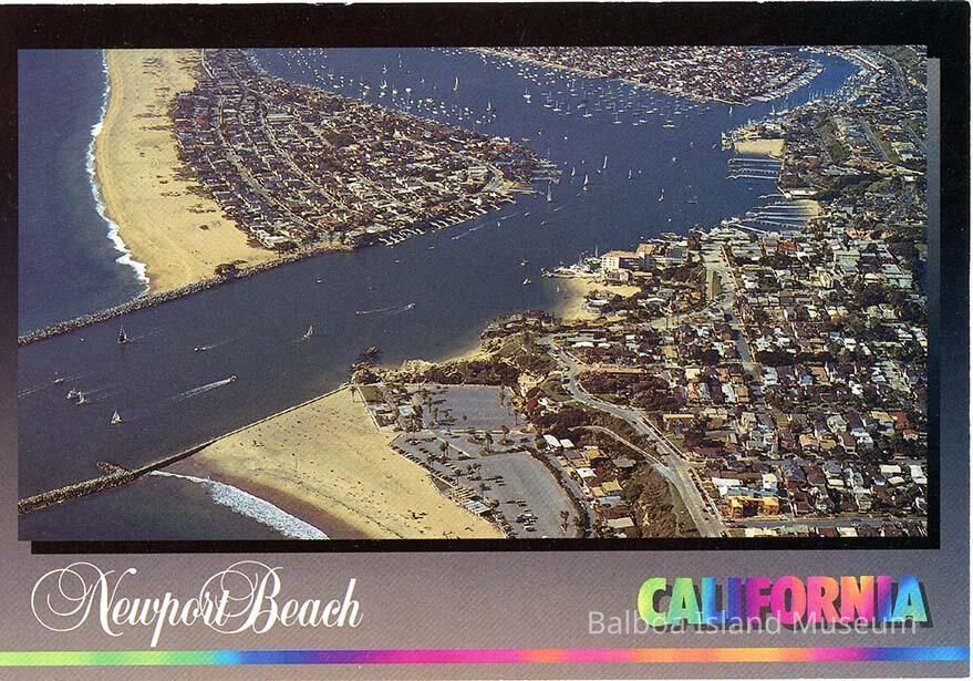 A color aerial postcard of the harbor entrance channel from over the Corona del Mar state beach. Shows the wedge and some of the Corona del Mar state beach. Balboa Island is partially visible along the top. Black to grey gradate background with "California" in rainbow and a rainbow bar along the bottom.