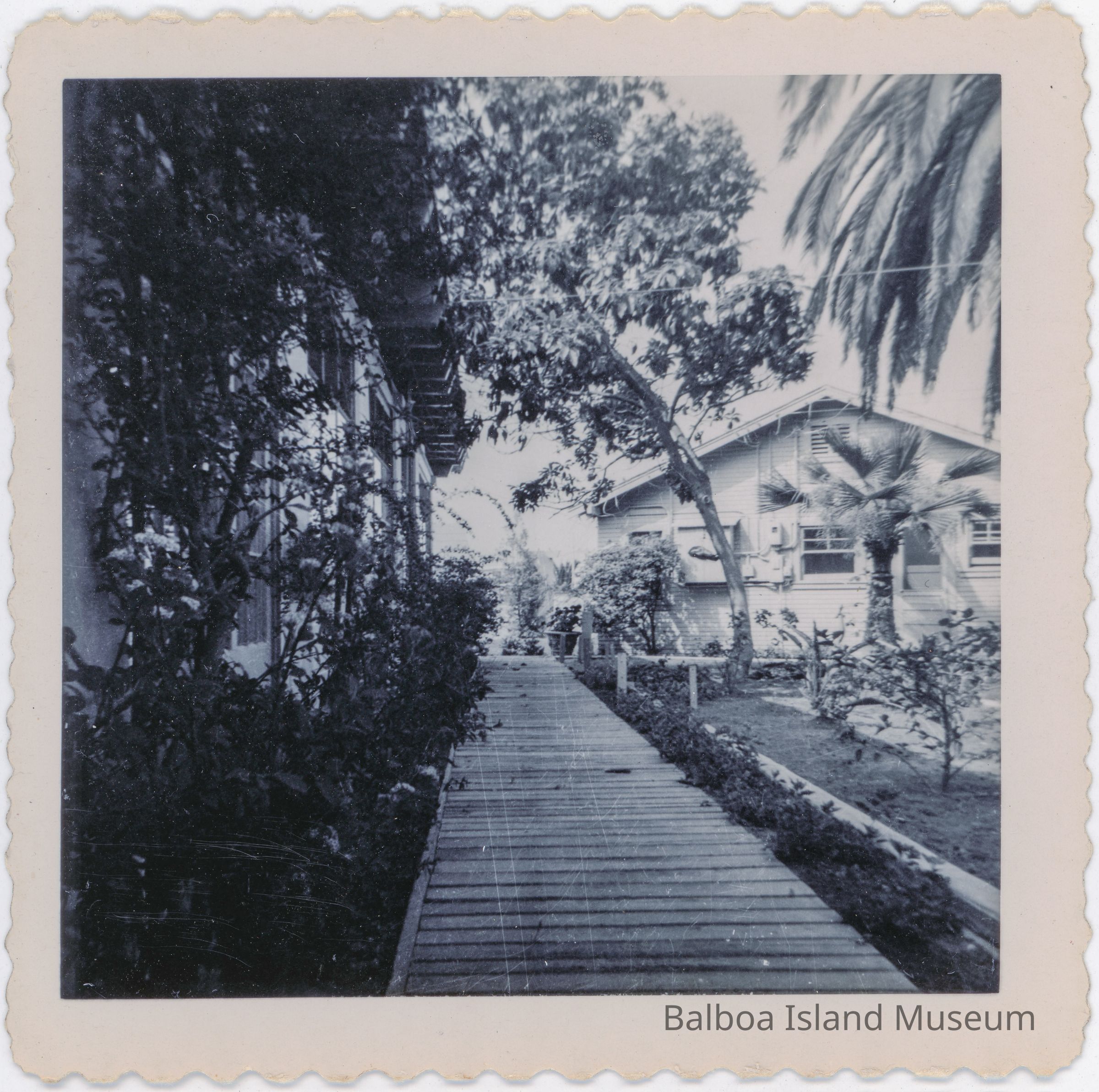 Photo from a walk way beneath trees with a home on the left and a home up front on the rightPhotograph Details