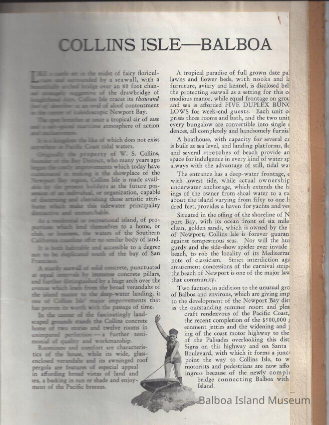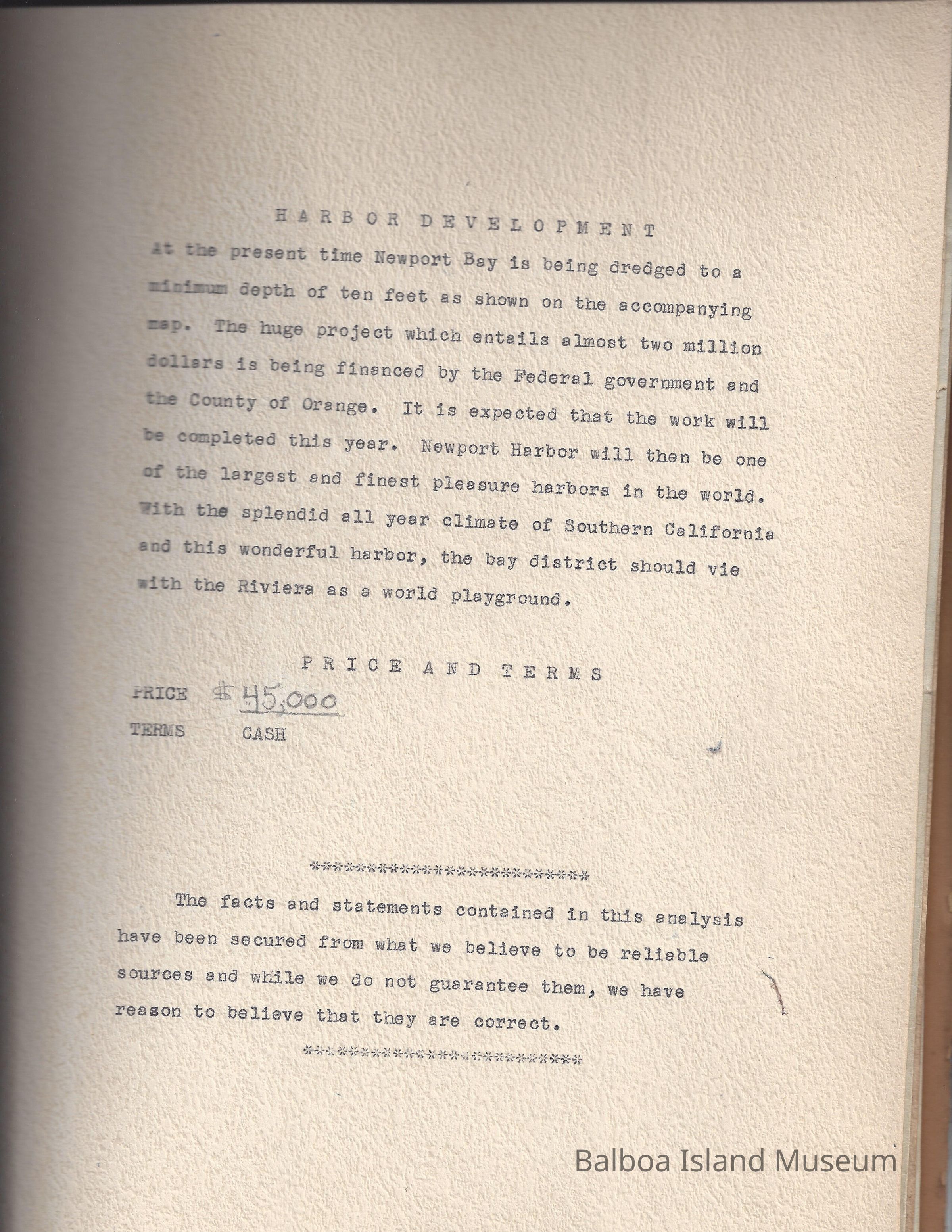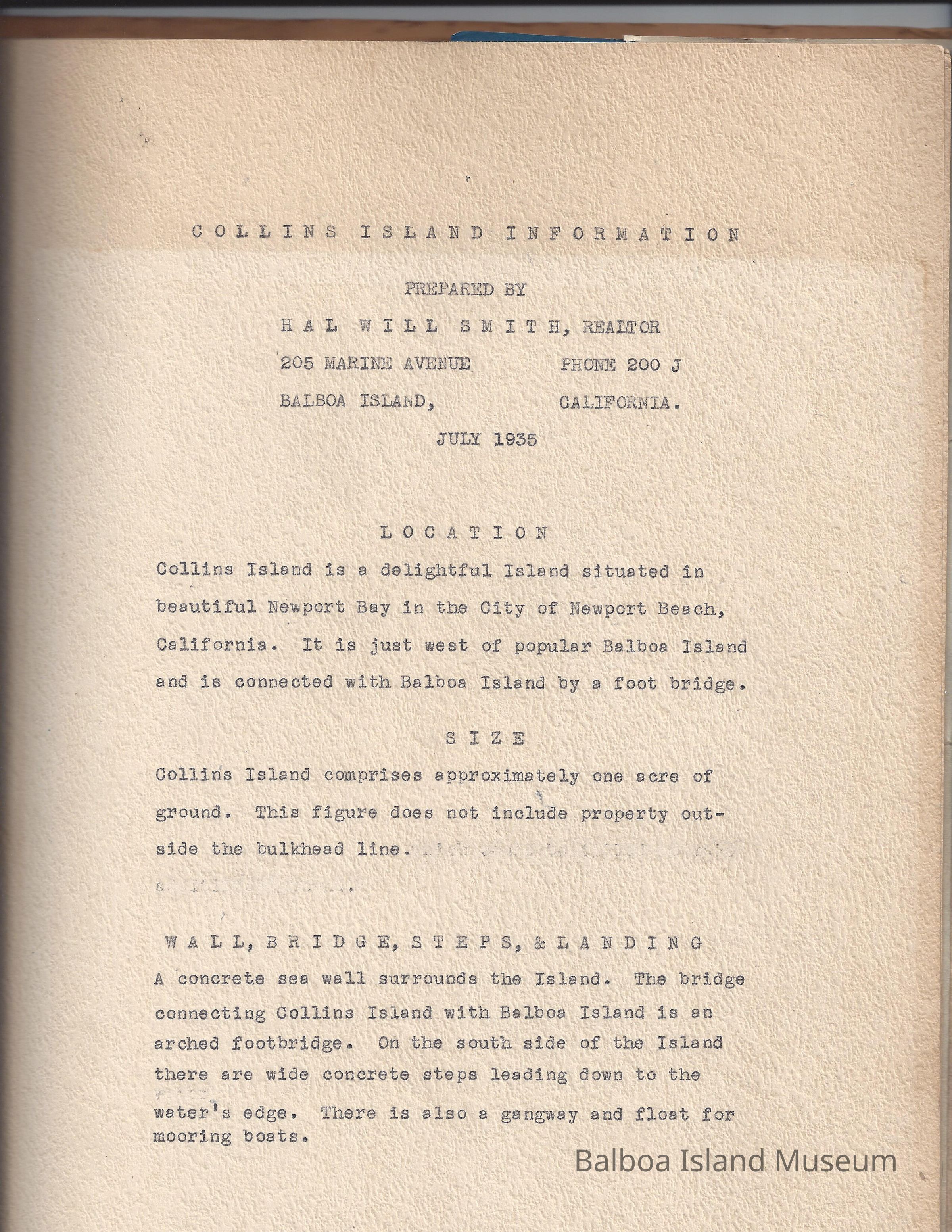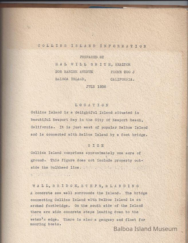 Sales presentation book created by Hal Will Smith for purchase of Collins Island for $45,000. Includes description of the island, its buildings, tax information, projected harbor development, maps, articles, etc.Collection