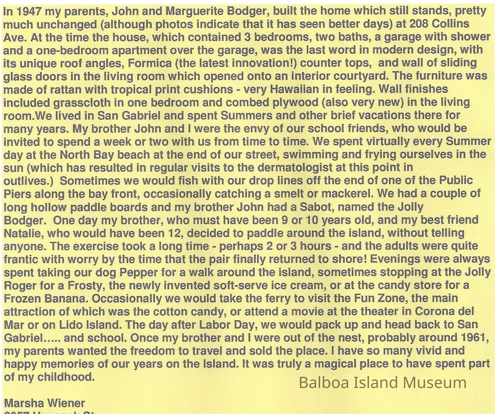 "My Story" was received by email from Marsha Wiener. Talks about her home on Collins and her experiences as a child spending time on Balboa Island.Collection