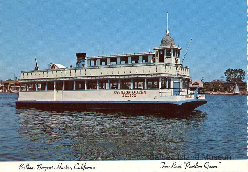 A color photograph of the Pavilion queen out on the harbor in front of Balboa Island (526 South Bay Front is just visible). A white banner on the bottom reads "Balboa, Newport Harbor, California; Tour Boat "Pavilion Queen" ".