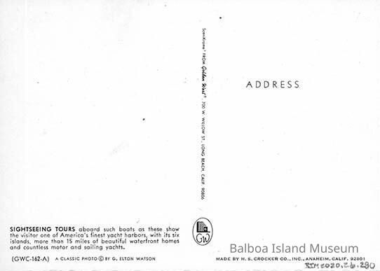 Unused. There is a small paragraph on the back about sightseeing in Newport Harbor. Photograph by George Elton Watson, published by Golden West in Long Beach, California. Postcard number GWC-162-A.Subject