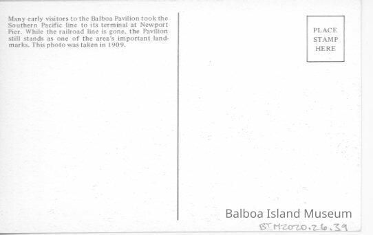 A colorized postcard of the Newport Pier train station looking towards the water and the rest of the pier. There is a train on the left side and a young boy sitting on the edge of the platform. The back has a summary of the history of rail lines in Newport Beach. Stamp box says "place stamp here". Textured print.Subject