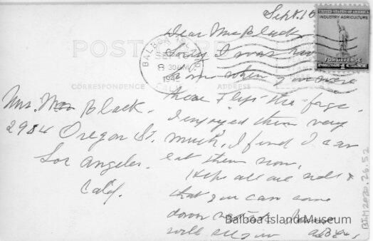 Sent on September 16, 1942. The message and address were written on the wrong sides of the postcard. Addressed to Ms. Black in Los Angeles. Green 1 cent For Defense stamp.Subject