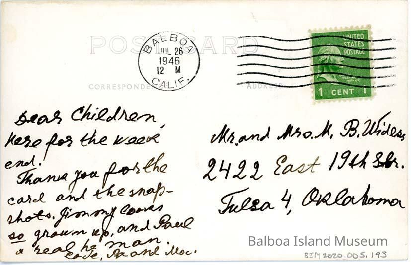 Sent on July 26, 1946 at 12 Midday to Mr. and Mrs. M. W. Widess in Tulsa, Oklahoma. No printer or publisher information. Sent with a green 1 cent Washington stamp.Subject