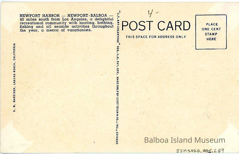 Unused. Published by R. M. Marriner in Laguna Beach and printed by Curteich-Chicago. Postcard or print number 8A-H1163. Linen print. The corners on the back have outlines that were likely intentional or may have been from a marker inside of an album. The marks are square except the corners which come to longer points.Subject