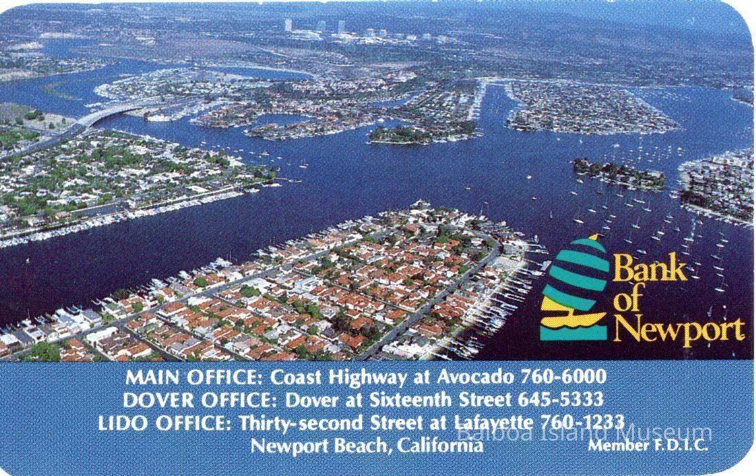 A small advertising card for the Bank of Newport with a miniature 1983 calendar on the back and an aerial photograph of the harbor from over Lido on the front. The bottom portion of Lido Island, the entrant to the Upper Newport Bay, the Newport Dunes, Harbor Island, Bay Island, and Balboa Island are all visible. Below the photograph are the list of offices for the bank in Corona del Mar, Dover, and Lido. The logo is in the bottom right corner of the photograph.Create Date