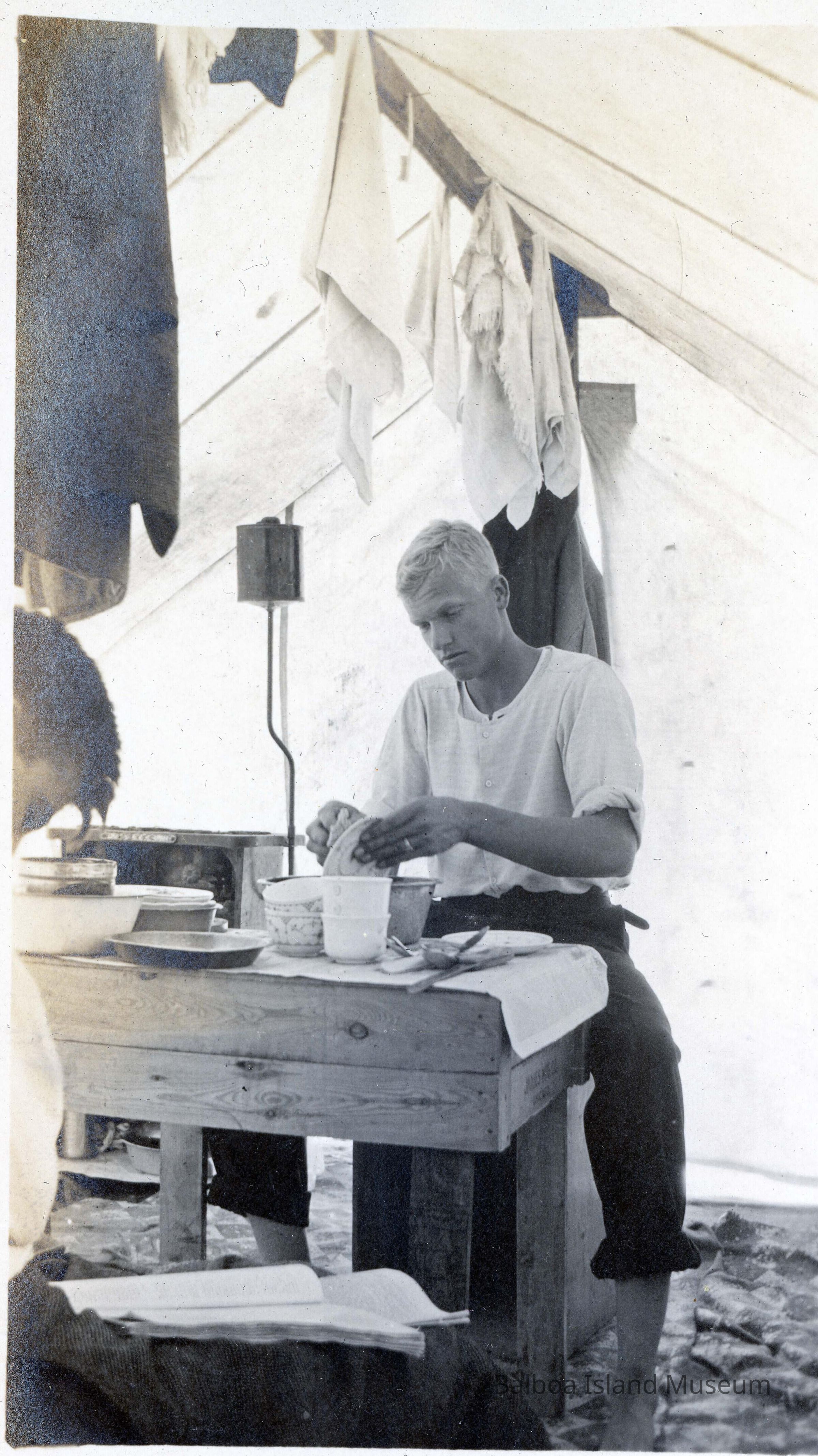 A photograph of Kenneth Smith washing dishes inside the tent on Balboa Island. A makeshift table from wooden beams and crates as well as a stool from a crate had been created to allow a workstation to be set up. There is some kind of a light behind him, though is unlit. Several rags and pieces of clothing appear to be hanging from the ceiling. There is another boy, dark haired, seated in front of the crate who appears to be reading.