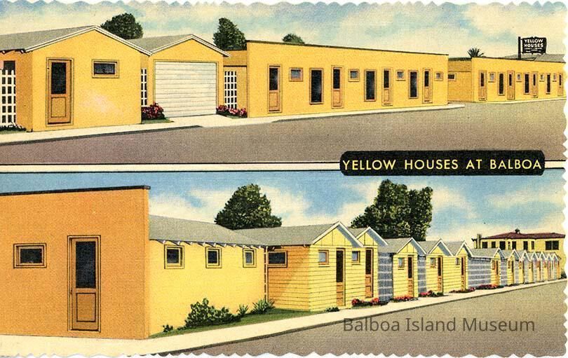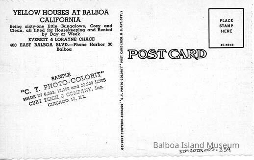 A colorized photograph of the Yellow Houses at Balboa printed with a linen texture and a scalloped edge. The postcard is a sample from the printer, Urteich-Chicago.