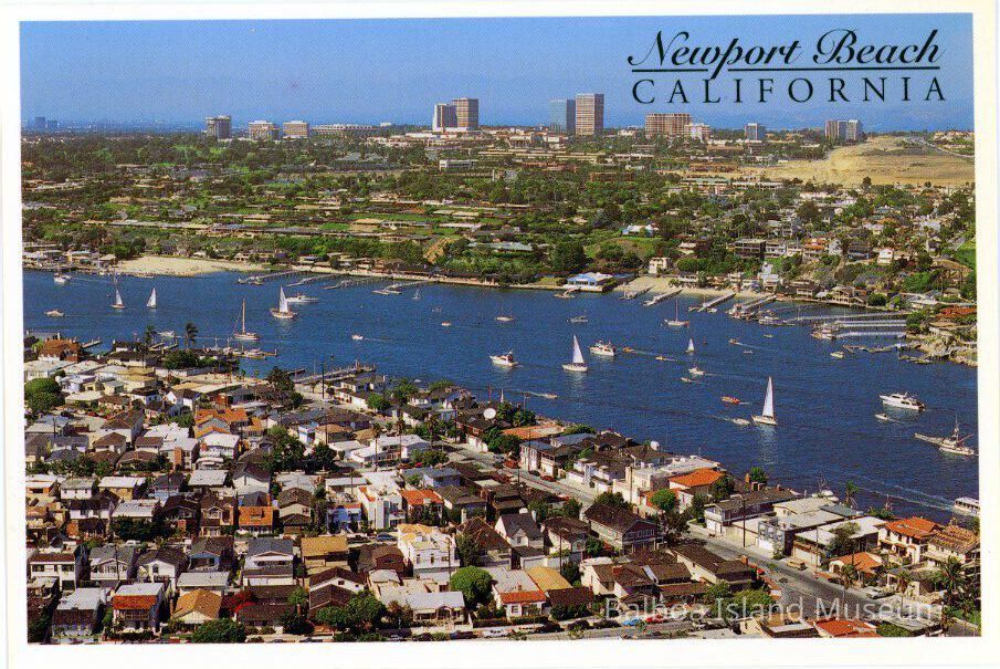 A color postcard with an aerial photograph taken of the harbor Entrance Channel around the Corona del Mar bend. Taken from above Oceanfront. The intersection in the bottom right corner is East Ocean Blvd and Channel Rd. The beach in the top left corner on the Peninsula side (the land mass along the bottom) is the Public Pier and kid beach where E. Balboa Blvd becomes Channel Rd. Title written in upper right corner in black print.