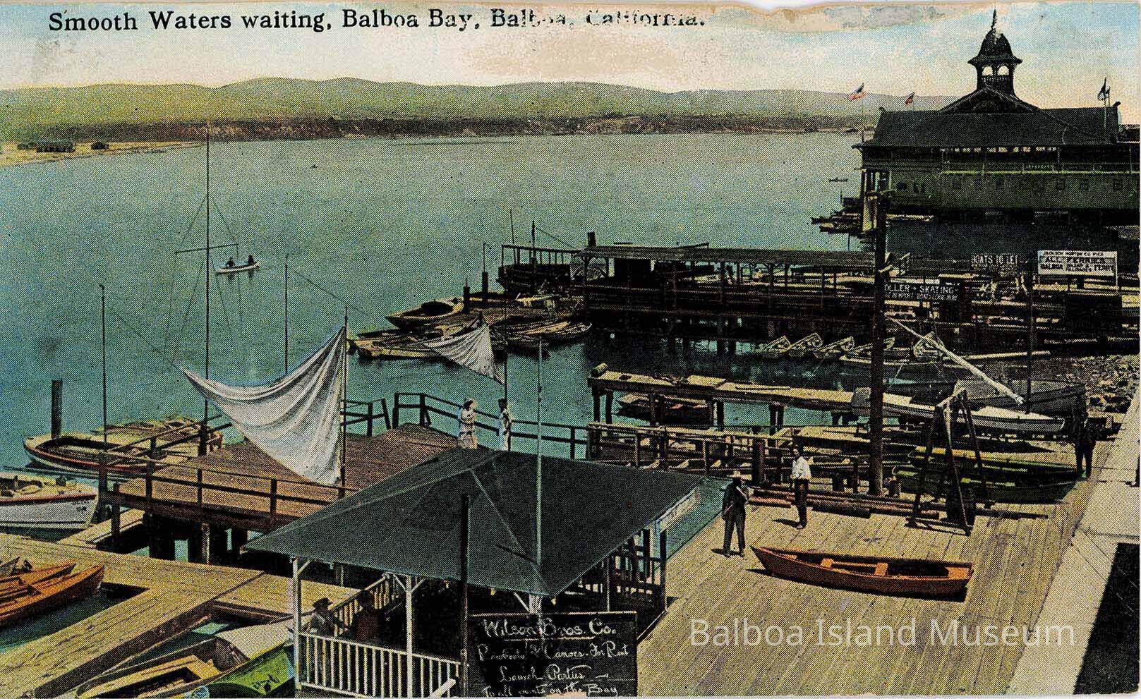 Three copies of a colorized photograph postcard of the area to the right of the Balboa Pavilion (looking towards the Harbor) which features docks and a Ferry landing for Balboa Island. There is a sign right along the bottom edge for Wilson Bros. Co. rentals. There are signs further back for roller skating, boats to let, and the ferries.