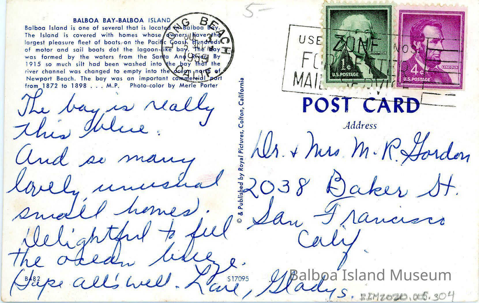 Sent on July 3, 1959 at 5:30 pm from Long Beach. It was sent to Dr. & Mrs. M. R. Gordon in San Francisco by Gladys. There is a small blurb on the back about Balboa Island and Balboa Bay written by Merle Porter. Published by Royal Pictures. Postcard number B482, Printer number S17095. Stamp cancel reads "Use Zone Nos. For Better Mail Service"- likely an encouragement for people to use zip codes when addressing mail.Subject