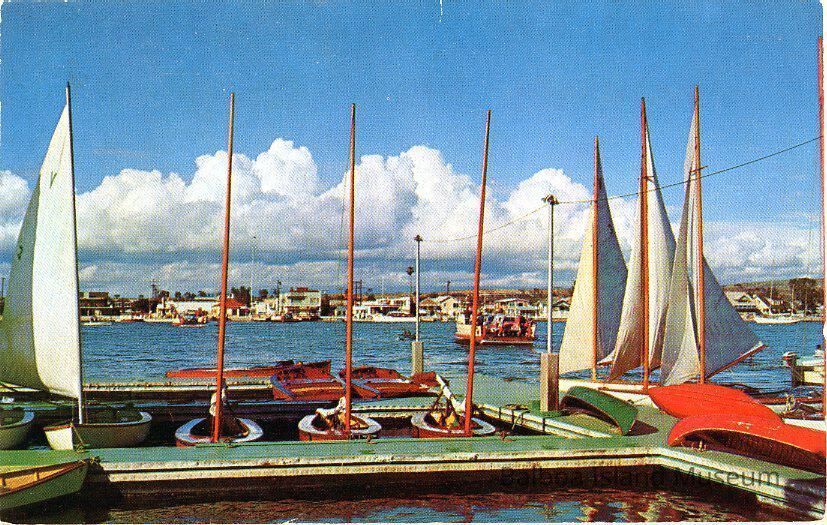 A color photograph postcard of the docks to the right of the ferry landing where boats can be rented from. Looking towards South Bay Front and the ferry landing on Balboa Island. One of the ferry's is visible heading towards the Island. There are three canoes on the dock, two red and one green. The docks are now part of Balboa Boat Rentals.