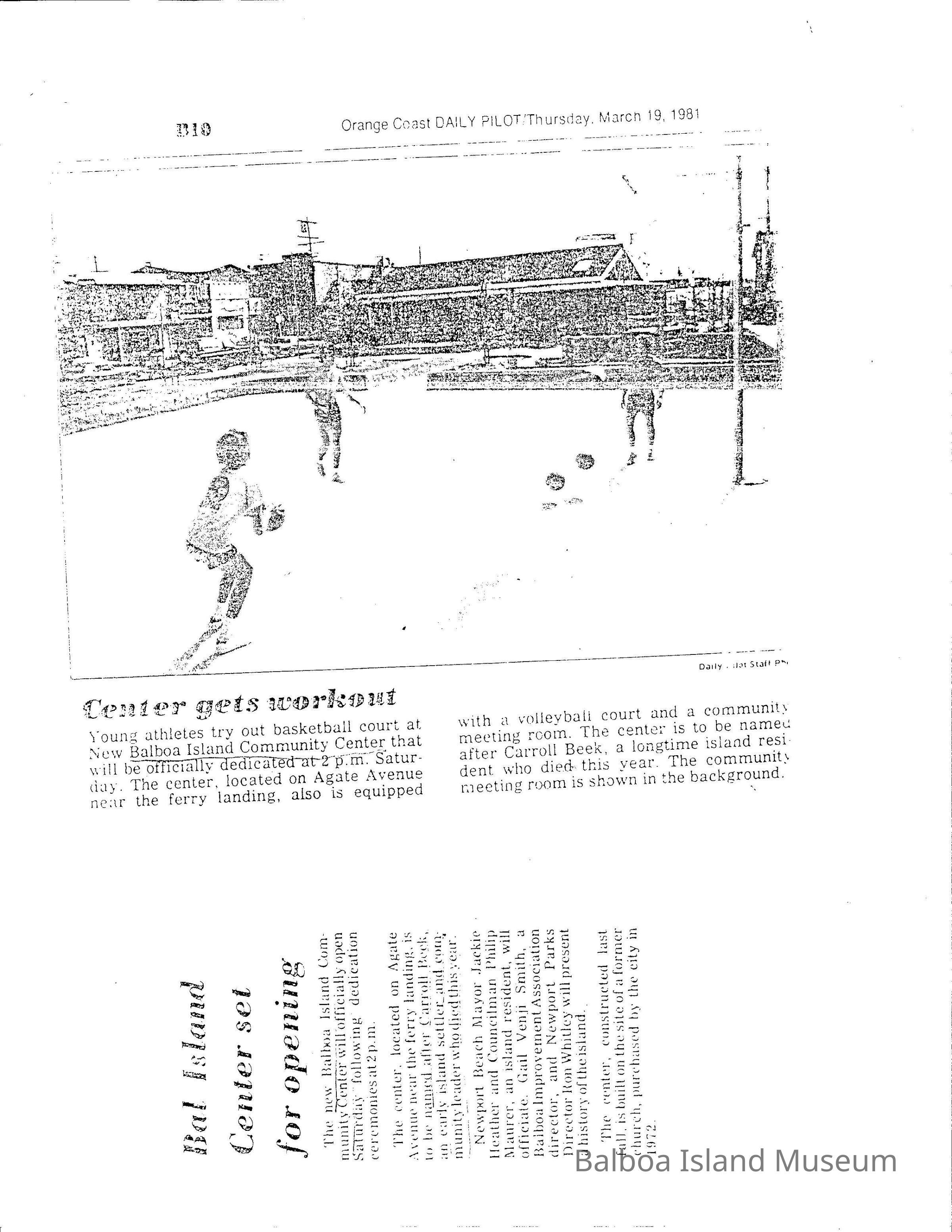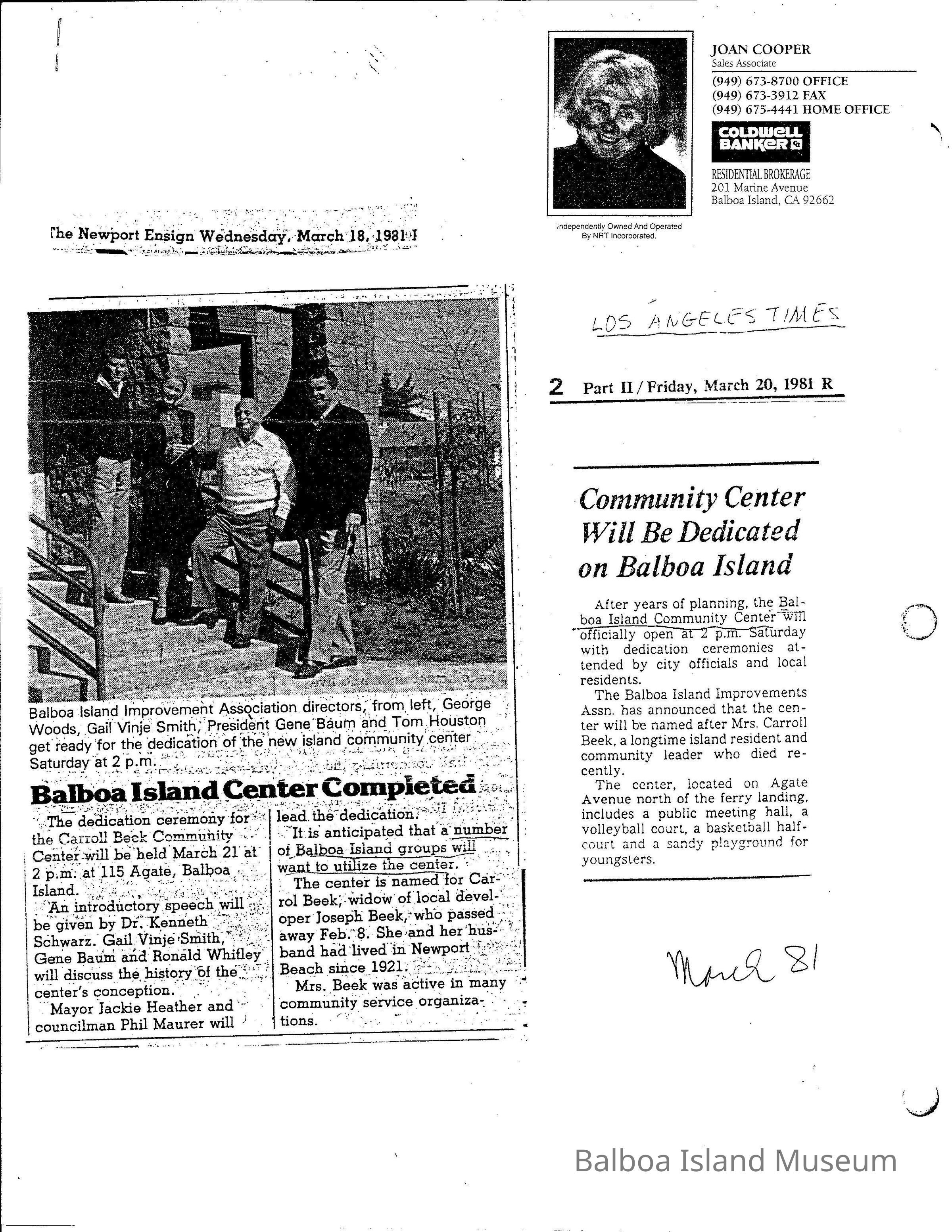 Copies of articles in the Newport Ensign, Daily Pilot, and L A Times about the dedication ceremony for the Carroll Beek Community Center