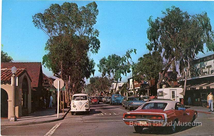 A color postcard of Marine avenue takenb from the Park marine intersection in front of the Village inn and looking towards Irvine terrace. There is a red convertable turing onto Marine.