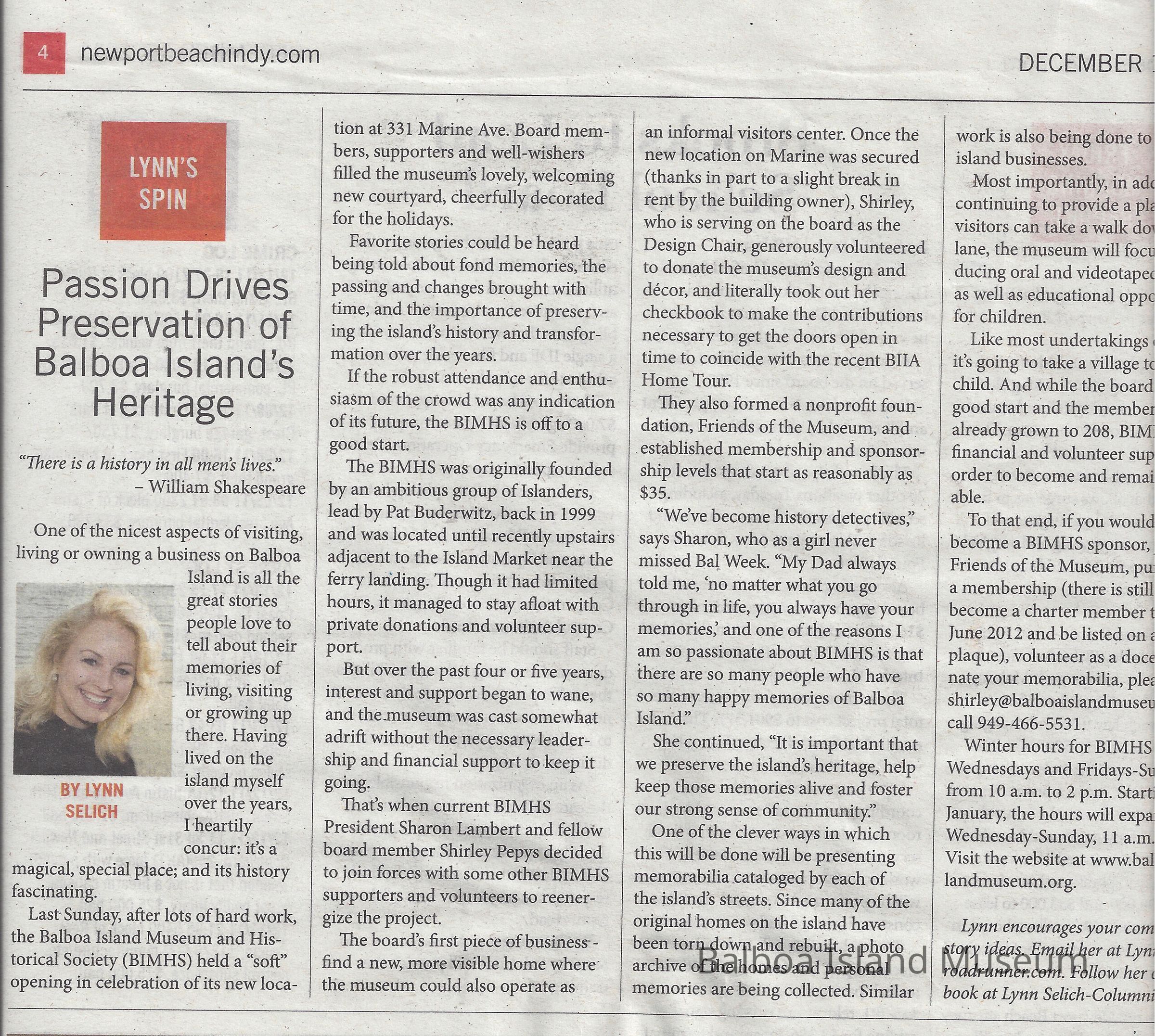 Newport Beach Independent article about the formation of BIMHS and relocation to 331 Marine