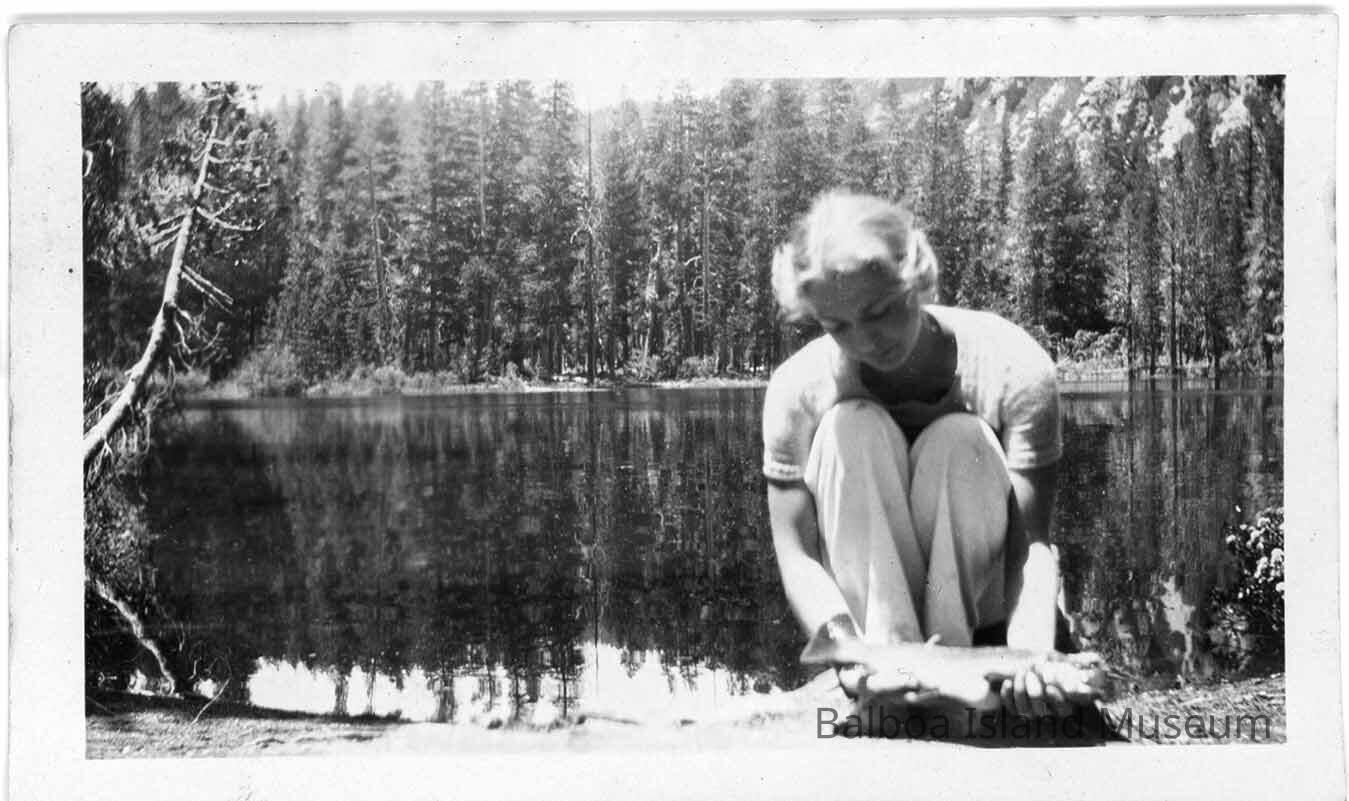 A black and white photograph of Helen Caldwell at a lake, possibly Lake Arrowhead, and holding a trout. She in crouched on the lakeshore and looking down at the fish.