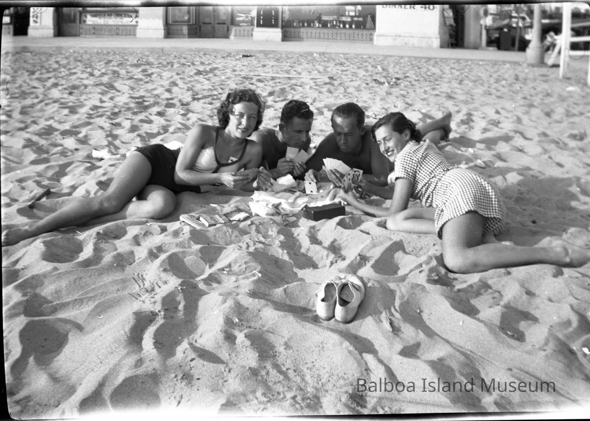 Friends on Balboa Beach playing cards. Harold Caldwell is sitting next to the women with the gingham dress on the right. The envelope holding the negative says " The Gang at Balboa Taken 1934 Summer"
