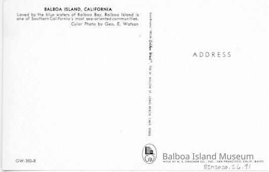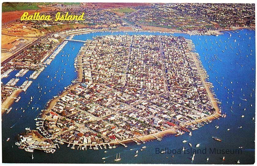 Aerial photograph of Balboa Island taken from the Collins Island end of the island after 1954 (houses on Collins island). Says Balboa Island in the upper left hand corner in yellow cursive letters.