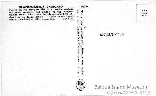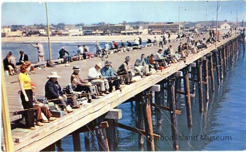 Two copies of a color postcard taken from the end of the Newport Pier on the right side of the former loading platform looking across the pier towards the West oceanfront Beach. There are fishermen and women lined along the pier.