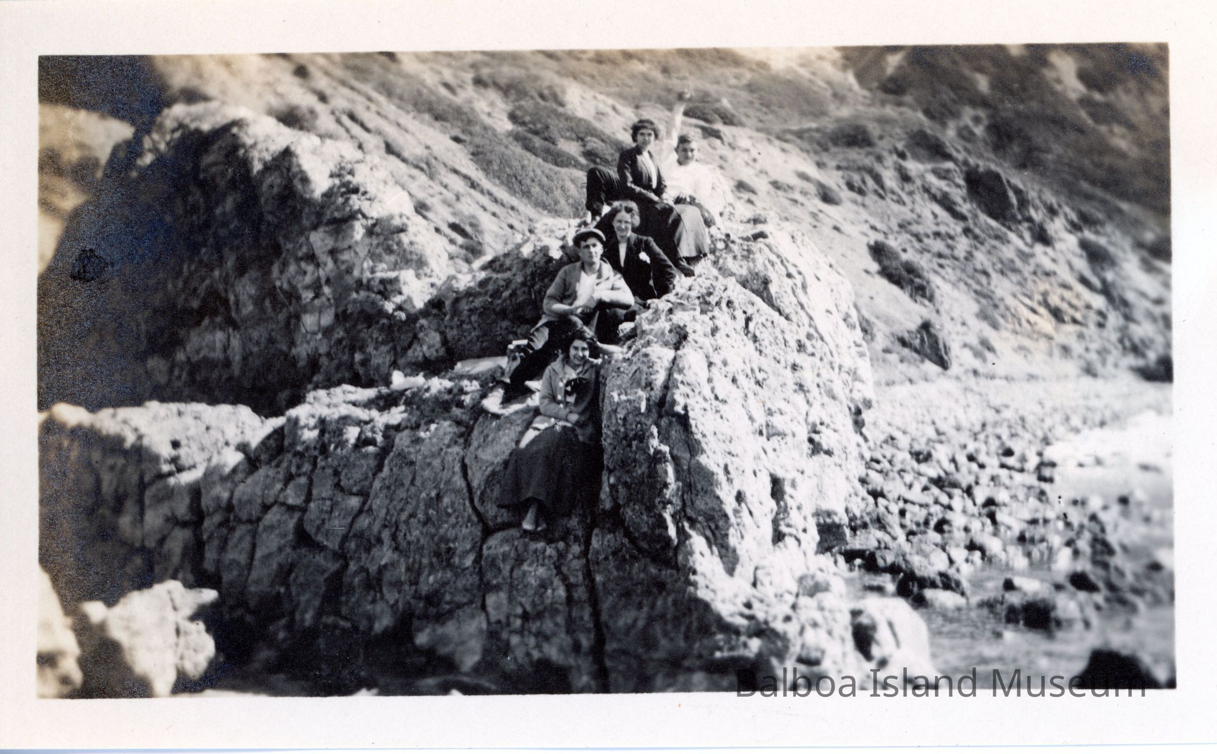 A photograph of a group of individuals, two boys and two girls, posing on a rock on Corona del Mar state beach, possibly as far down as Little Corona or near the south east end of the beach. The man at the back of the group might be Kenneth Smith.