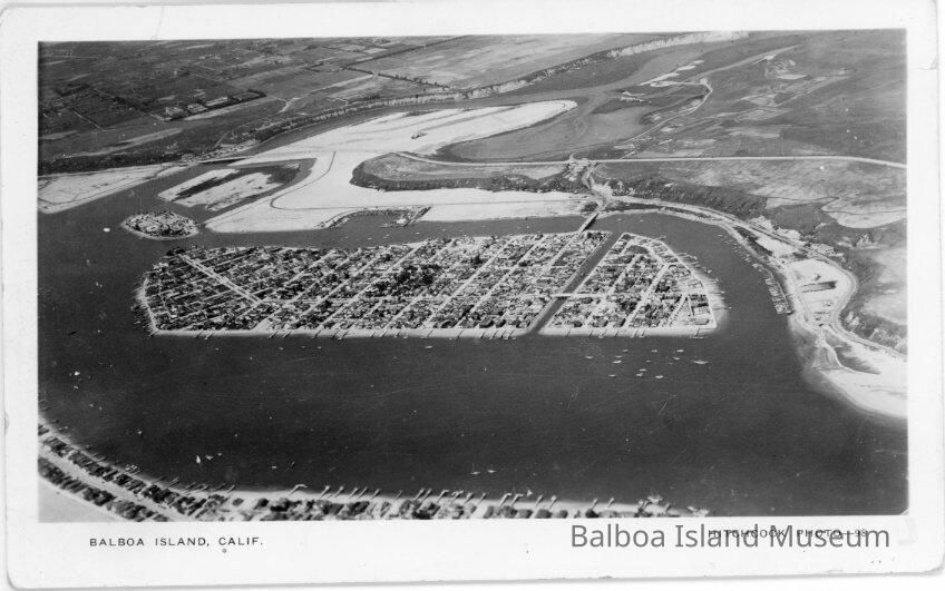 A black and white aerial photographic postcard featuring an image of Balboa Island taken from the area. The entire bayside area and the lower Newport Bay area are undeveloped save the Yacht Basin on Bayside.