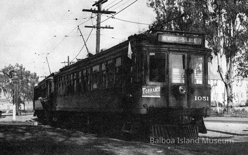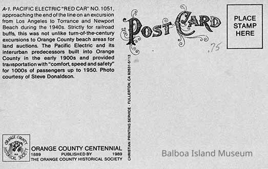 A replica postcard created for the Centennial of Orange County (1989) by the Orange County Historical Society. The card features an image of the old Red Car that used to run between Los Angeles and Balboa. The Train is number 1051 and has a sign that indicates Torrance is the next stop. The car banner reads "Newport-Balboa" and there is a man hanging off the back car.