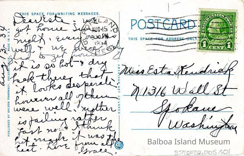 Published by Balboa Pharmacy in Balboa and made in the USA. Printed by Curteich-Chicago (C. T. Photochrom) in Chicago. Postcard printer number 55153.Subject