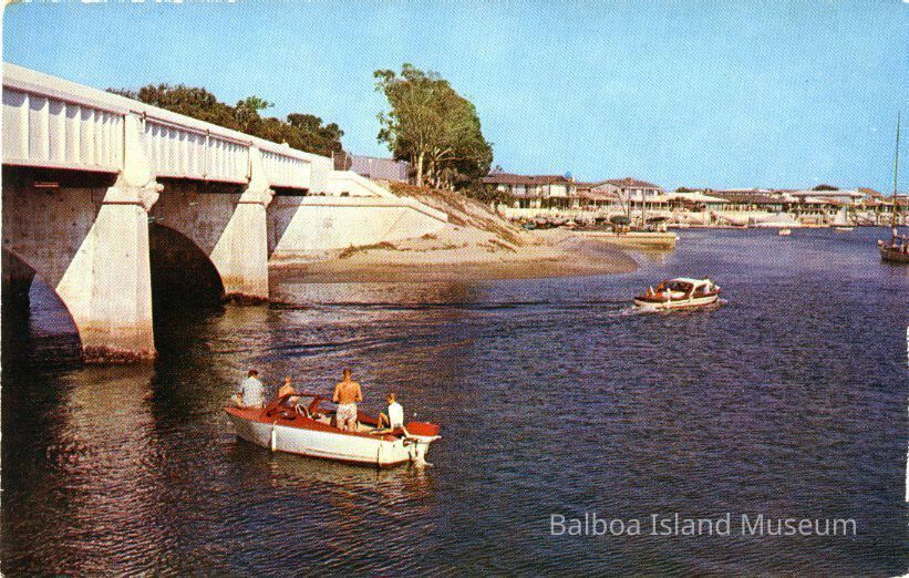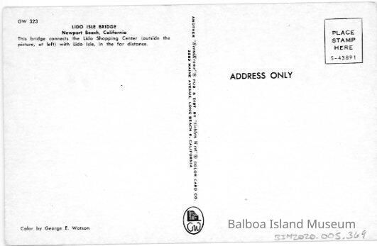 A color postcard of the bridge onto Lido Island taken from the water or the bank.