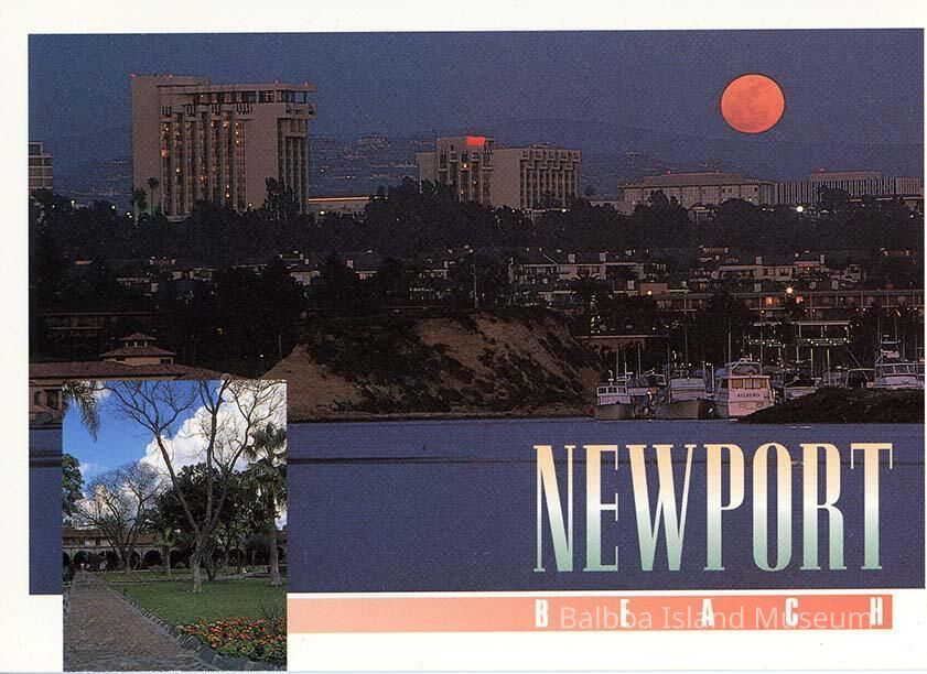 A collage color postcard with two overlapping images. One is a large image taken from the harbor at night looking towards the hills and what might be Fashion Island. There is a large reddish moon visible in the background. The second image is smaller and taken during the day. It shows a building with archways along the bottom floor and a park or courtyard (could be the Newporter Inn area). Newport Beach is written on the front with Newport overlapping with the large photograph and Beach written in a peach-colored gradated box below.