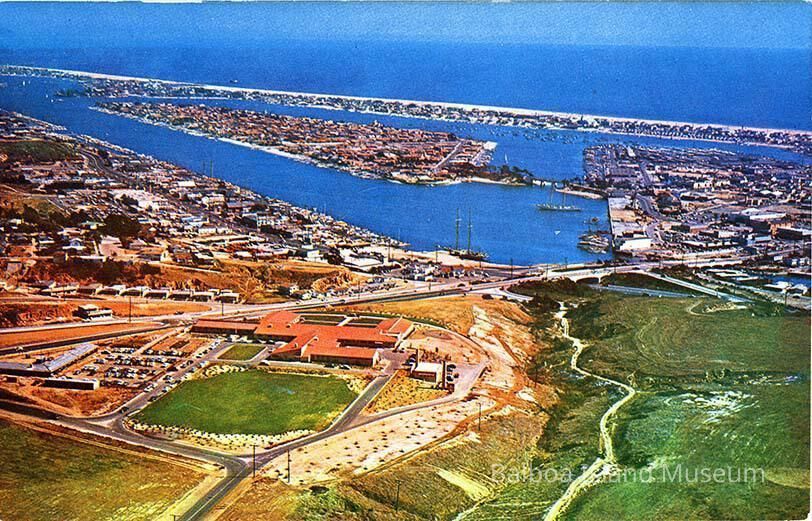 A color aerial postcard of Hoag hospital and the turning Channel in Newport harbor looking towards the ocean. The area around Hoag hospital is undeveloped for the most part, though there might be a golf course to the right. The tall tower has not yet been built- the building is single story.