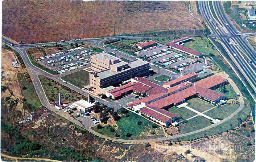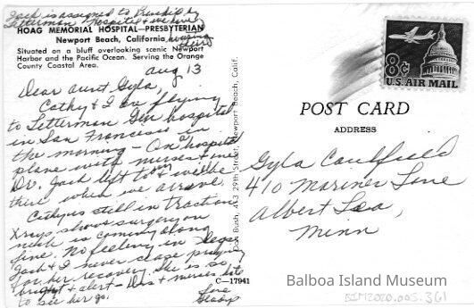 Two copies of a color postcard of Hoag Memorial Hospital taken from the air