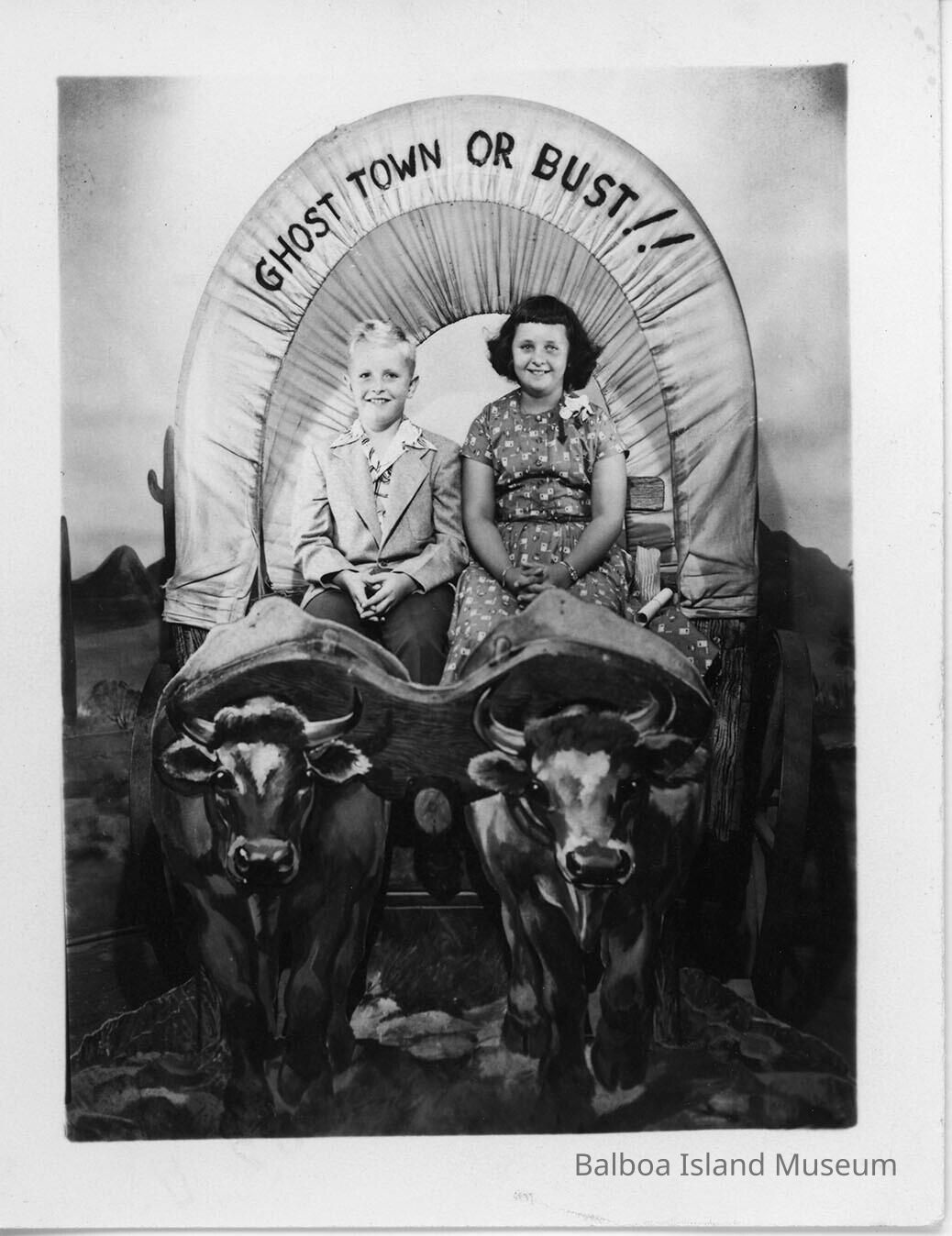 A black and white photograph of Gary Caldwell (left) and Judy Goff (right) at a photo booth in Knott's Berry Farm's Ghost Town. The back reads "Thursday June 18- 53, Gary Caldwell, 10 yrs 5 mo February 24, 1943, and Judy Goff, age 10 yr 6 mo 12 days November 6, 1942. The back also features order information by number, the price of reprints and enlargements, and the address to mail requrests to.Photograph Details